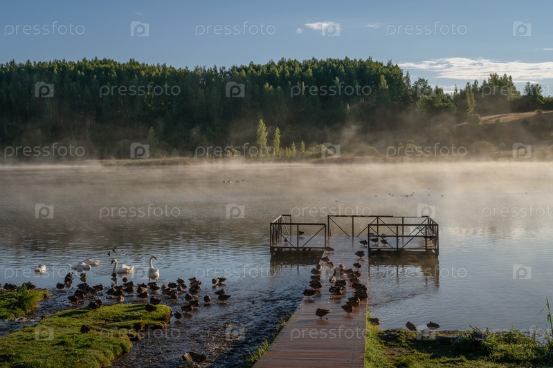 Вид на Городищенское озеро с водоплавающими птицами в Изборско-Мальской долине солнечным летним утром, Изборск, Печерский район, Псковская область, Россия