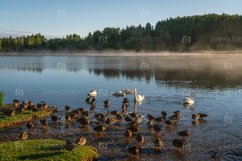 Вид на Городищенское озеро с водоплавающими птицами в Изборско-Мальской долине солнечным летним утром, Изборск, Печерский район, Псковская область, Россия