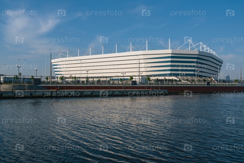Футбольный стадион для матчей Кубка мира на берегу реки Преголя в солнечный летний день, Калининград Россия