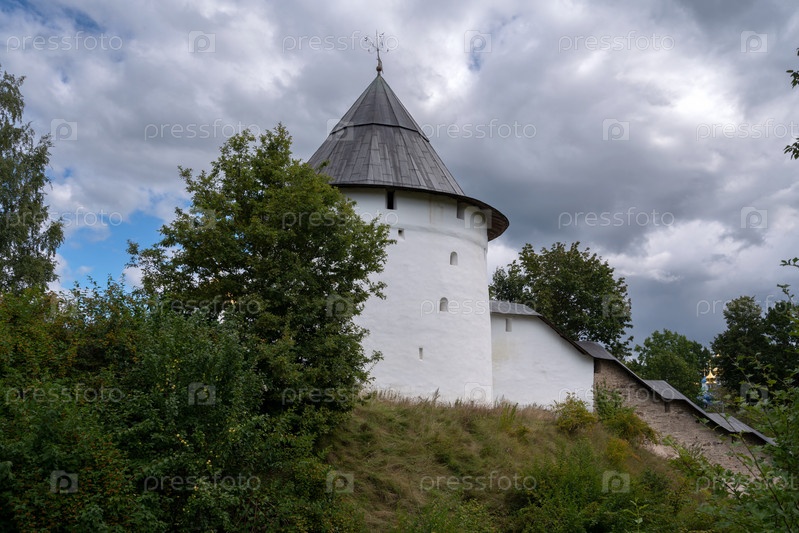 Вид на Тайловскую башню Свято-Успенского Псково-Печерского монастыря в солнечный летний день, Печоры, Псковская область, Россия