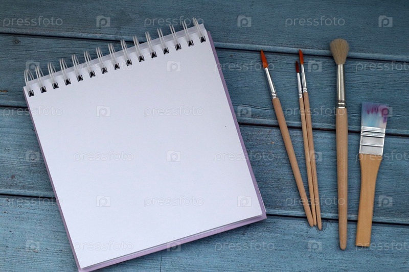 Художественный альбом и кисточки на синих деревянных досках. Вид сверху