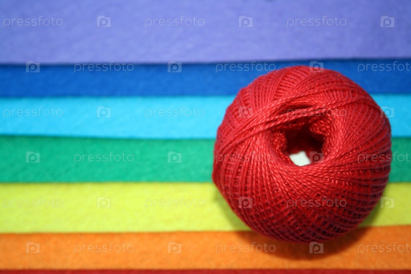 Клубок ниток на красочном войлоке на синем фоне
