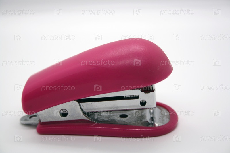 Розовый канцелярский степлер на белом фоне