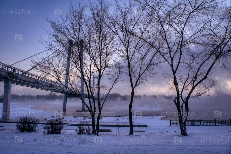 Морозное туманное утро над Енисеем в центре Красноярска