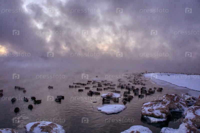 Морозное туманное утро над Енисеем в центре Красноярска