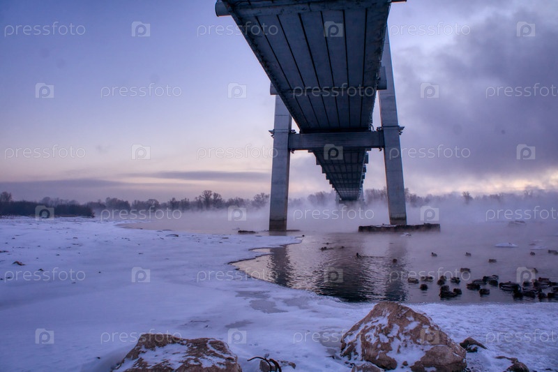 Морозное туманное утро над Енисеем в центре Красноярска