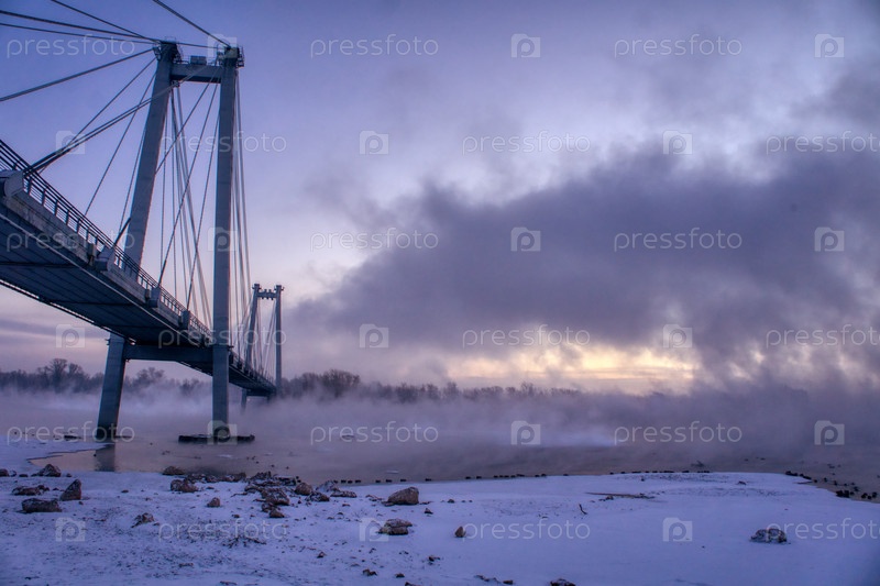 Морозное туманное утро над Енисеем в центре Красноярска