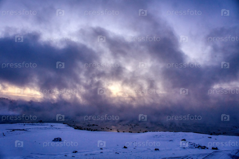 Морозное туманное утро над Енисеем в центре Красноярска