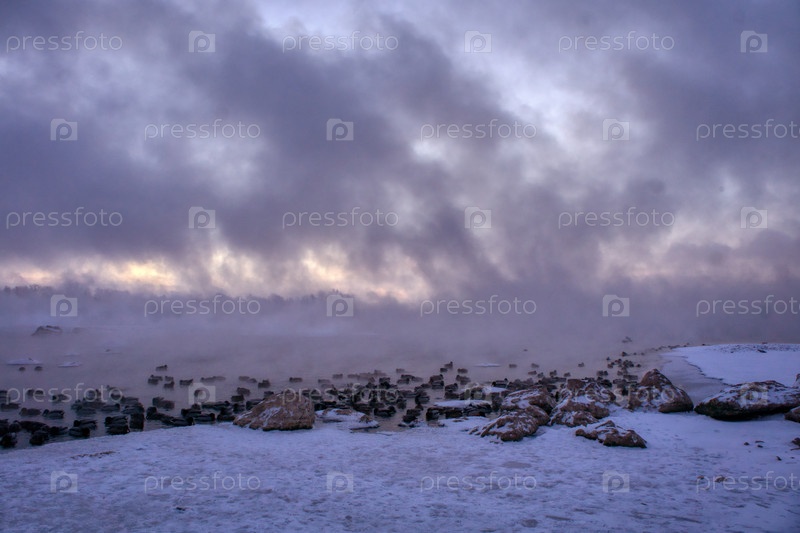 Морозное туманное утро над Енисеем в центре Красноярска