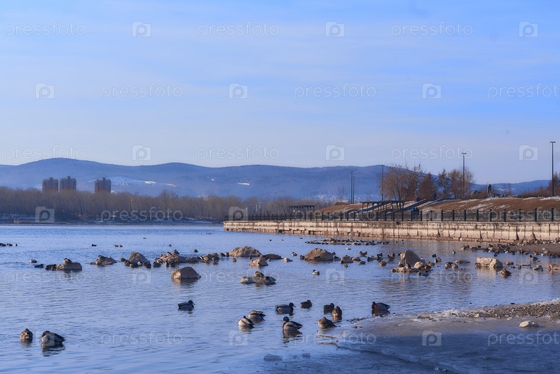 Енисей в центре Красноярска в яркий весенний день