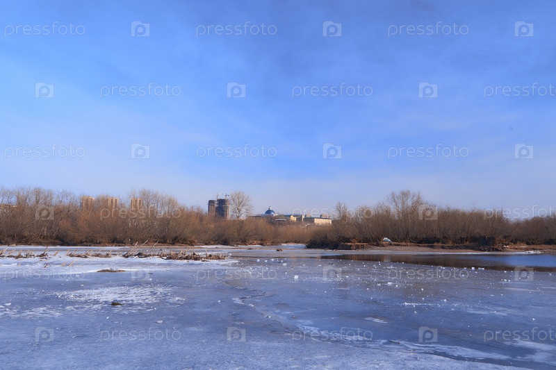 Енисей в центре Красноярска в яркий весенний день