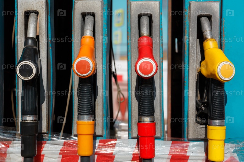 Сервисная АЗС с топливом. Заправочный пистолет бензонасоса. Бензозаправочная станция