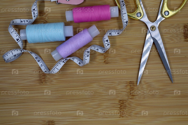 Набор швейных принадлежностей на деревянном фоне. Ткань, нитки, сантиметр и ножницы
