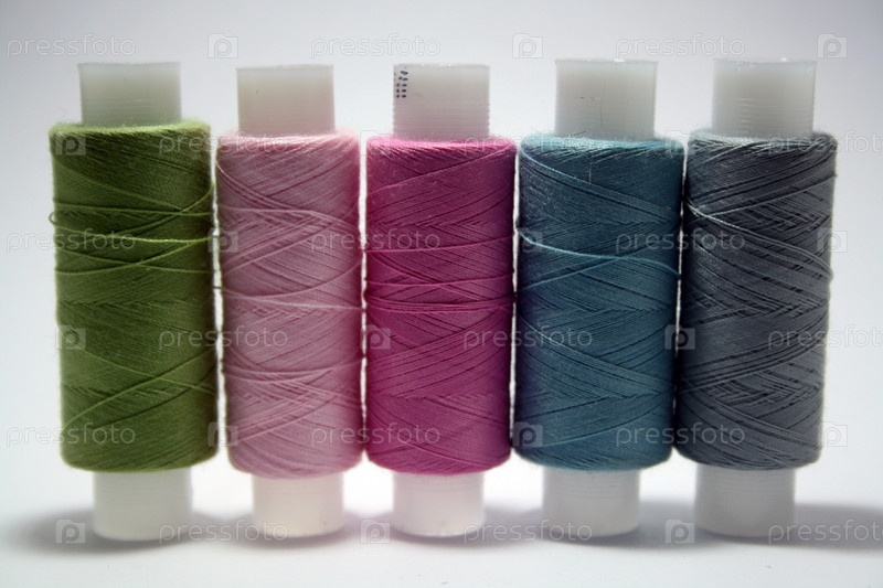 Красочная пряжа на катушке, хлопок. Красочные швейные нитки на белом фоне