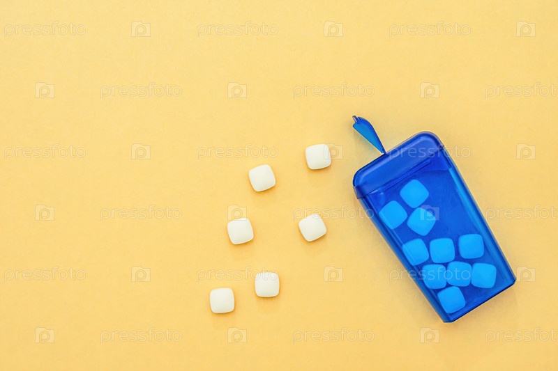 Мятные жевательные конфеты выпадают из упаковки на желтую поверхность