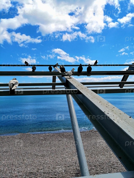 Вид на море на фоне голубого неба и белых облаков, голуби на заборе пляжа