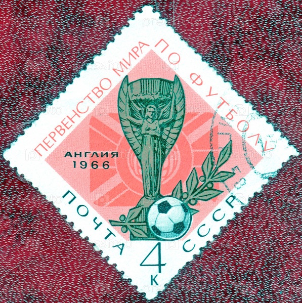 СССР-около 1966: Почтовая марка, напечатанная в СССР, с изображением футбольного кубка, с надписью "Чемпионат мира по футболу в Англии 1966", из серии "Футбол"