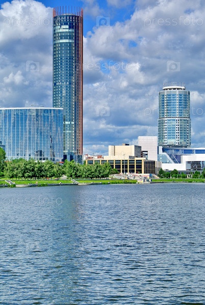 Вид на современные здания, прогулка по на набережной Екатеринбурга