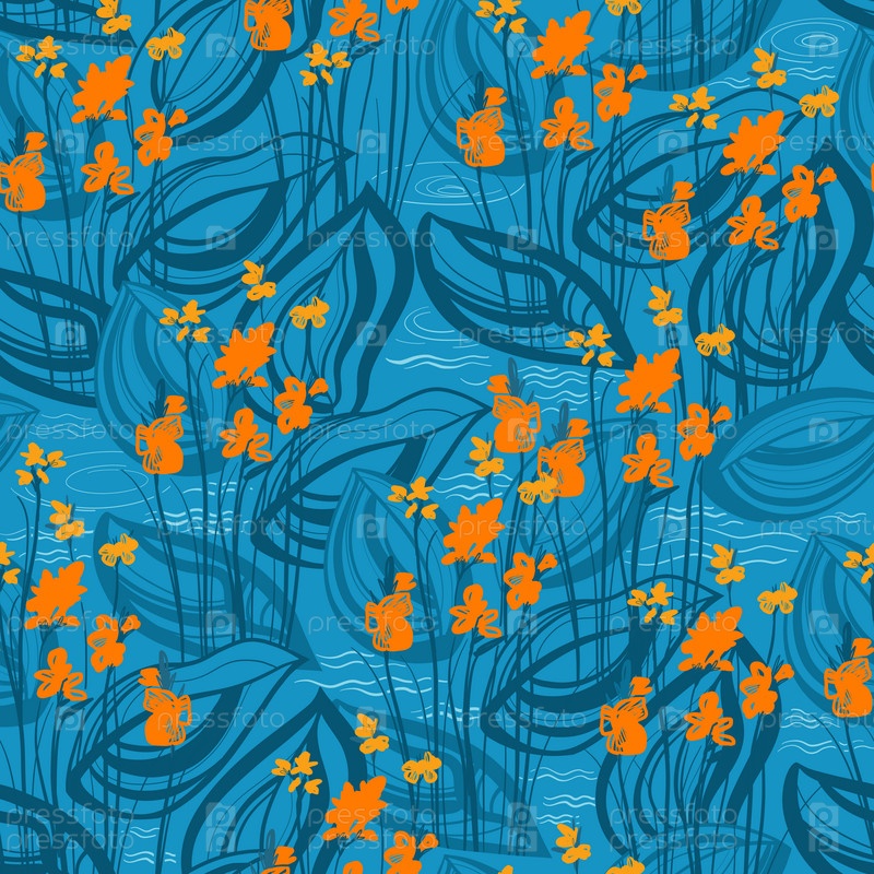 Бесшовный узор с оранжевыми цветами у воды на синем фоне