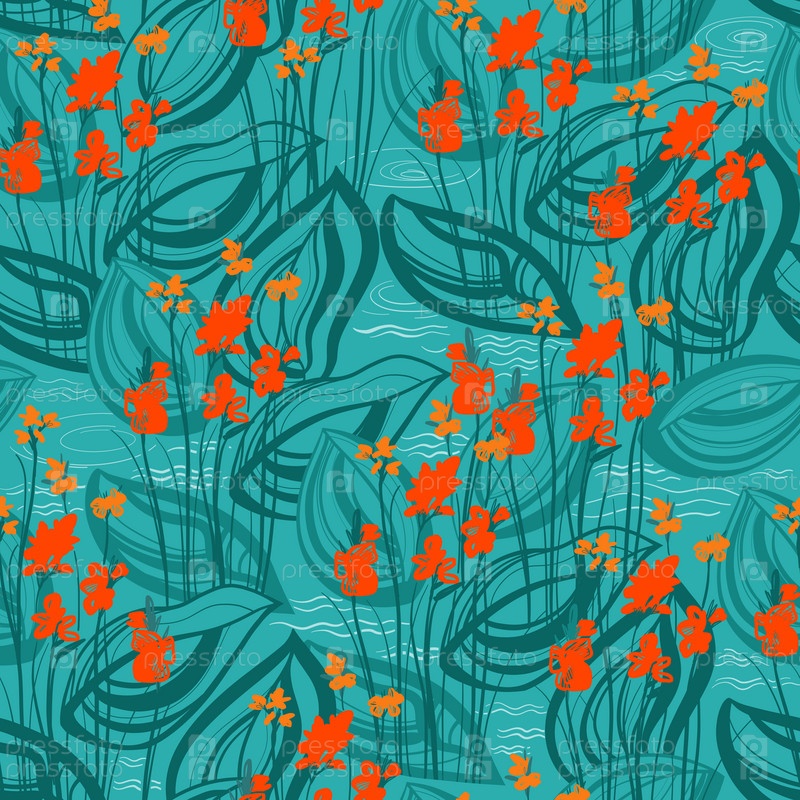 Бесшовный узор с красными цветами у воды на бирюзово-зеленом фоне
