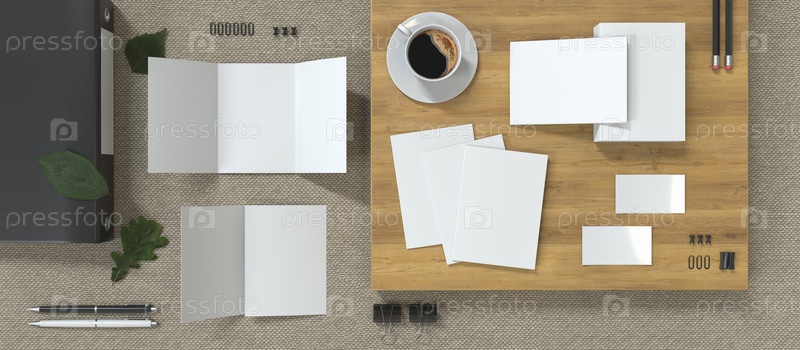 Трехстраничный пустой макет брошюры с двумя линиями изгиба и двумя визитками. 3D-рендер