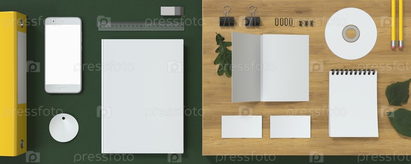 Пустой макет фирменного стиля. Книга, телефон, буклет визитки и блокнот на столе