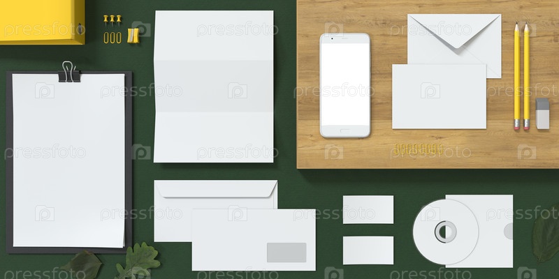 Пустые макеты: конверты, компакт-диски, телефон и визитки. для презентаций и портфолио дизайнеров