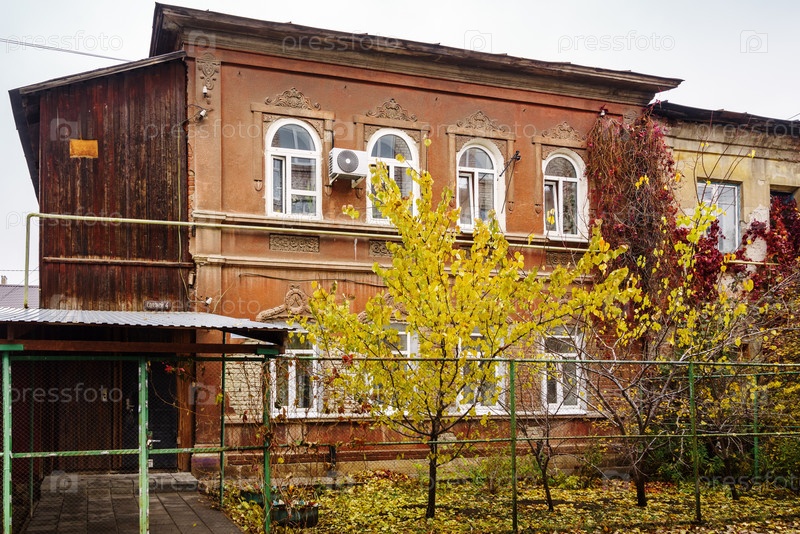 Фасад старого дома с лепниной. Осень в городе. Снимок сделан в России, в Оренбурге