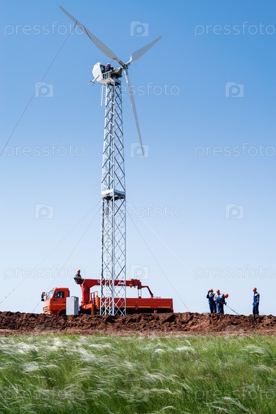 Оренбург, Россия - 26 мая 2020 г.: Установка ветряной турбины в ковыльной степи. Автовышка на строительной площадке
