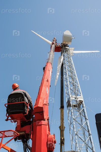 Рабочий оператор автовышки на рабочем месте. Установка ветрогенератора. Россия, Оренбургская область