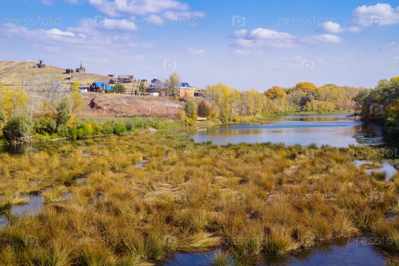 Саракташ, Россия - 1 октября 2020 г.: река Сакмара и кемпинг Красная гора на берегу