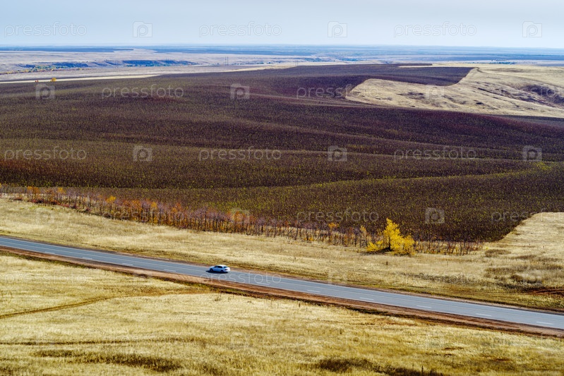Осенний пейзаж с шоссе, проходящим мимо поля с неубранными подсолнухами. Фото сделано в России, федеральная трасса Оренбург - Самара