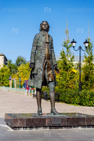 Оренбург, Россия - 24 сентября 2020 г.: Памятник первому российскому императору на площади Петра Великого