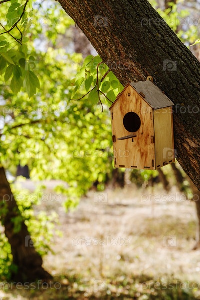 Деревянный скворечник, прикрепленный к стволу дерева в городском парке. Снимок сделан осенью в России, в городе Оренбург