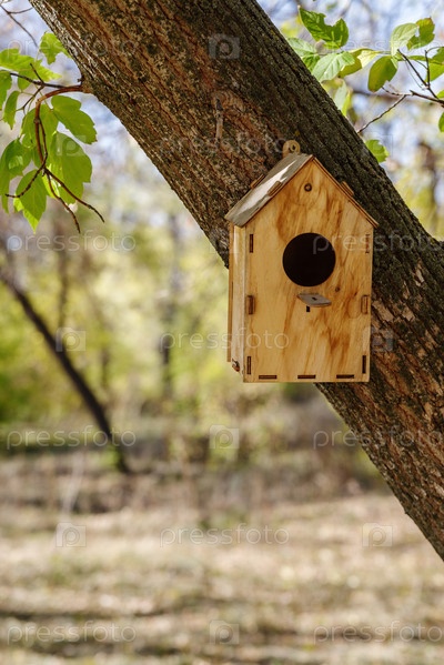 Деревянный скворечник, прикрепленный к стволу дерева в городском парке. Снимок сделан осенью в России, в городе Оренбург