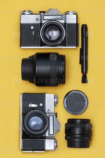 Рабочее оборудование фотографа, камеры, объективы, аксессуары на желтом фоне. Вертикальное фото