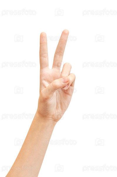 Два пальца подняты вверх как символ победы на белом фоне