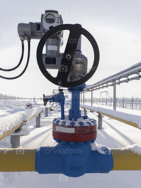 Задвижка с маховиком и электроприводом. Перекрытие участка конденсатопровода. Концепция нефтяной, газовой промышленности. Фон промышленной площадки