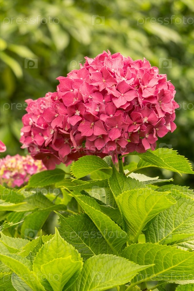 Куст ярко-розовых цветков гортензии, крупный план, в летнем зеленом саду
