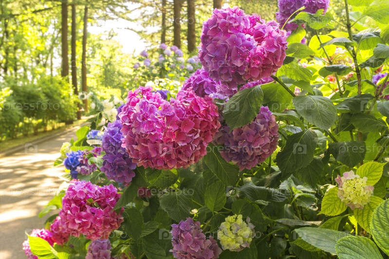 Большой куст цветков гортензии. Солнечные лучи пробиваются сквозь сосновый лес