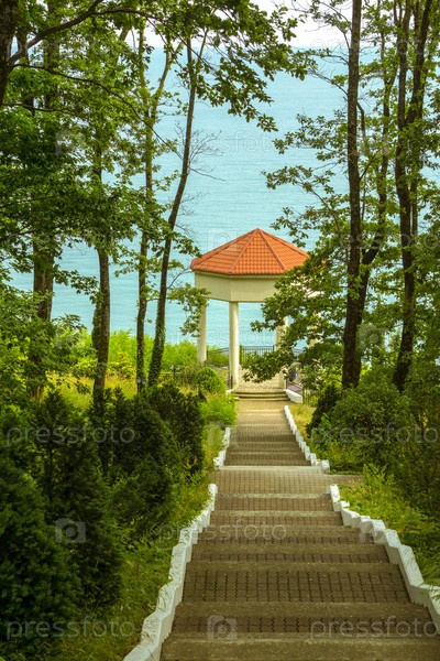 Выход к беседке с видом на море, через лес по ступеням южного курорта
