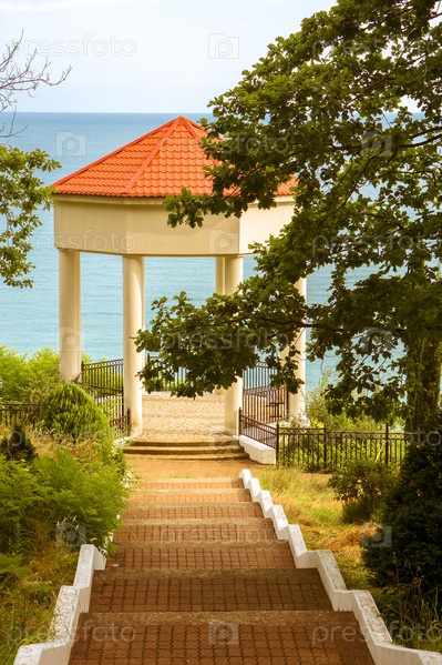 Красивый вид на море с беседкой. Доступ к морю по лестнице. Черное море, Краснодарский край