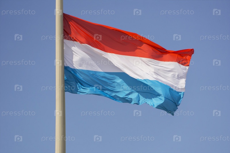 Флаг Нидерландов, крупный план, на фоне безоблачного голубого неба