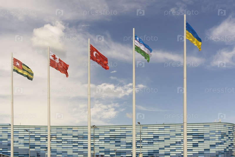Развевающиеся на ветру флаги разных стран мира на фоне голубого неба с копировальным пространством,