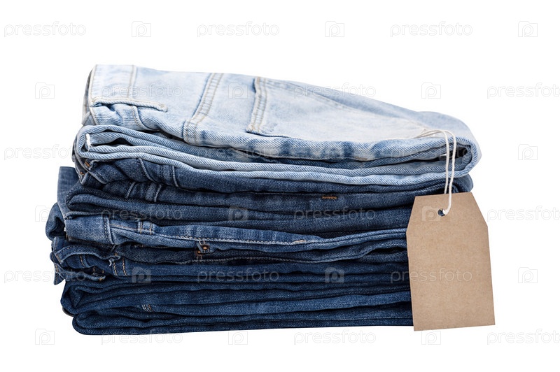 Стопка джинсов с этикеткой на белом фоне