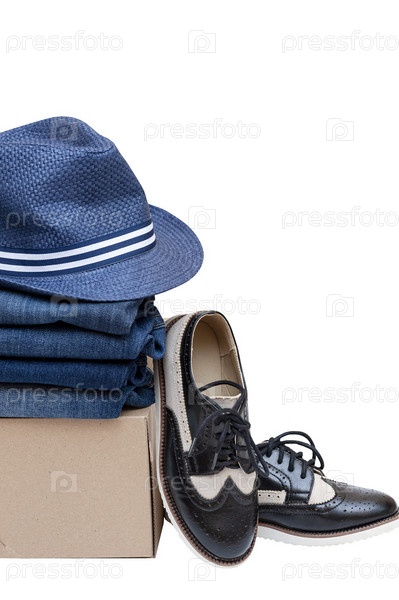Стопка темно-синей одежды на коробке и обуви. Концепция комиссионного магазина, перепродажа, секонд-хенд. Вертикальное фото