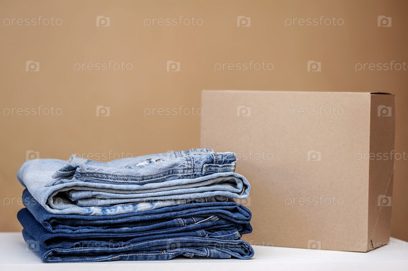 Концепция одежды. Стопка разных джинсов и коробка для онлайн-доставки на столе