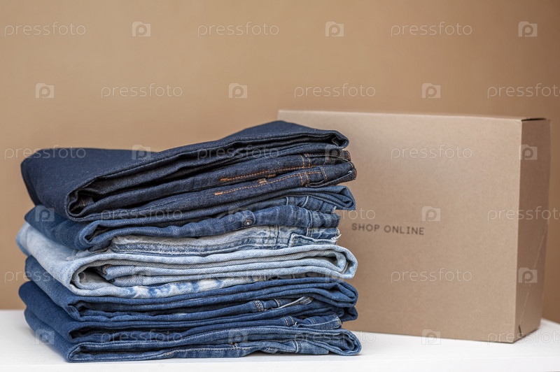 Стопка разных джинсов и коробка для онлайн-доставки на столе