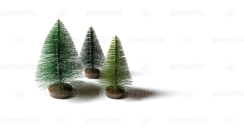 Маленькие искусственные елки, изолированные на белом фоне. Минимальная зимняя концепция. Баннер. Копировать пространство