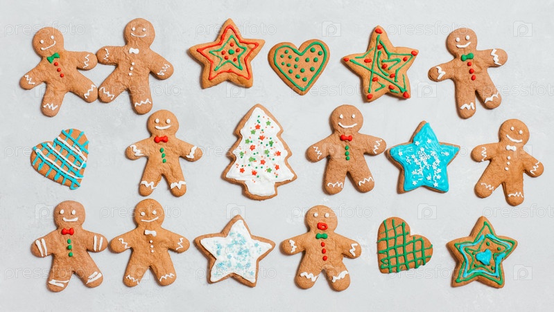 Рождественское печенье на сером фоне. Домашнее имбирное печенье с разноцветной глазурью. Пряничный человечек, звезда и елка. Вид сверху, плоская планировка